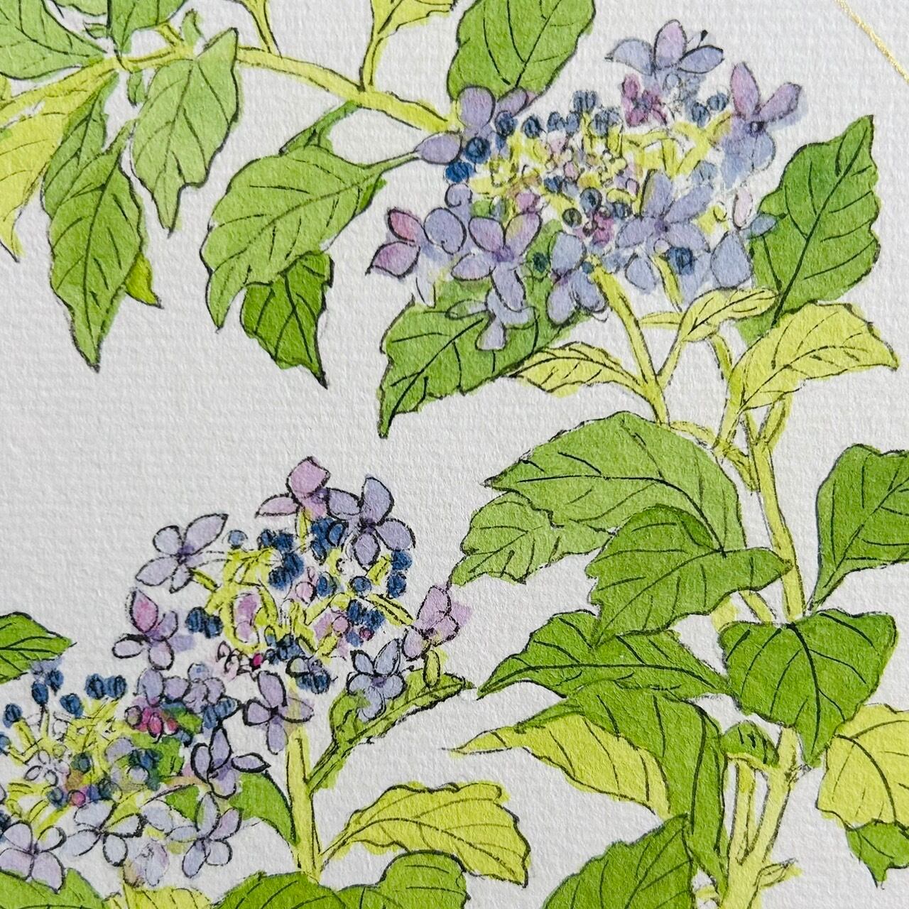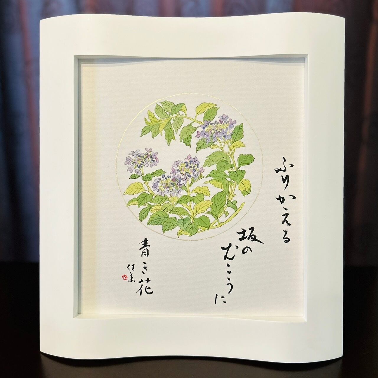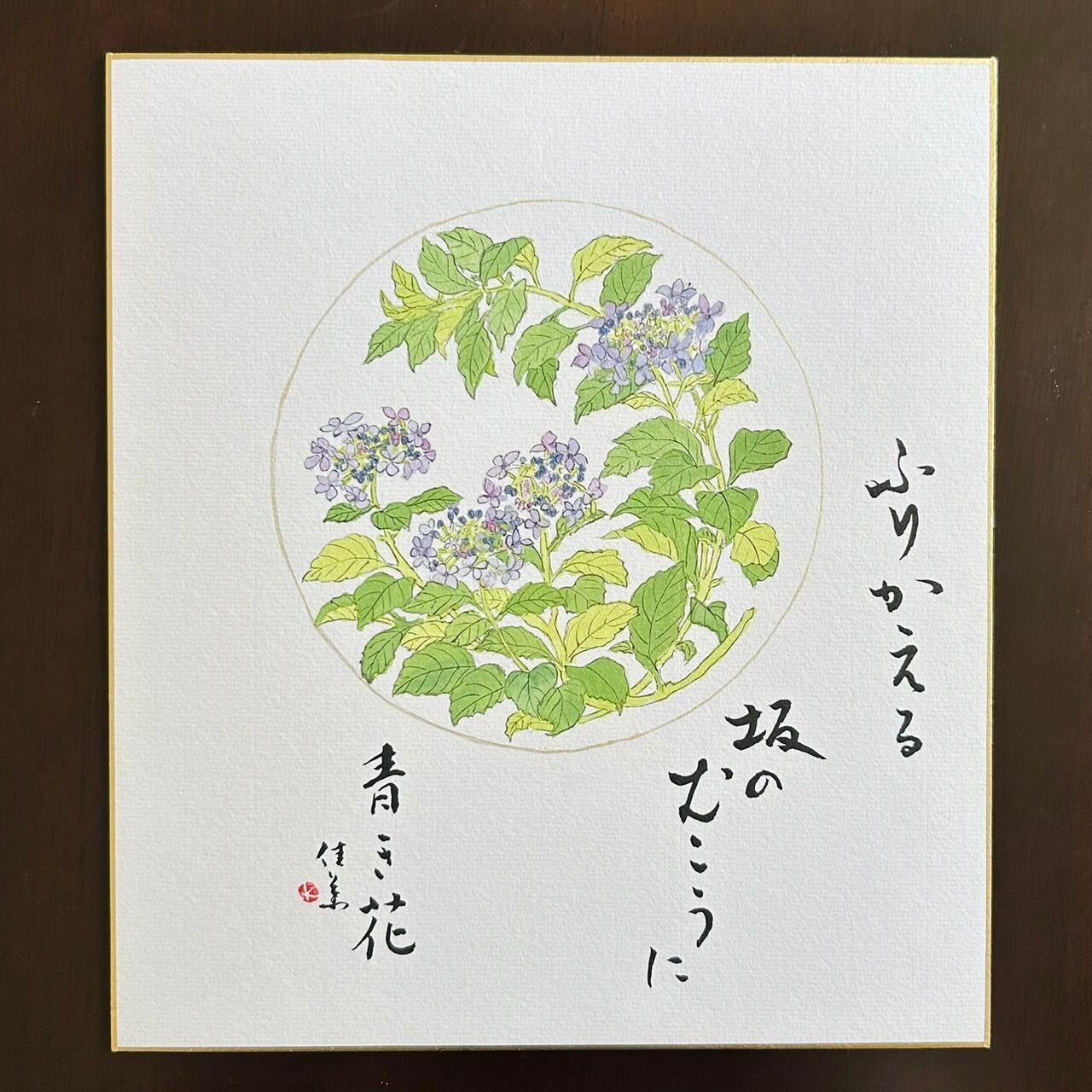 ふりかえる 坂のむこうに 青き花|ガクアジサイ・書と画のアート作品